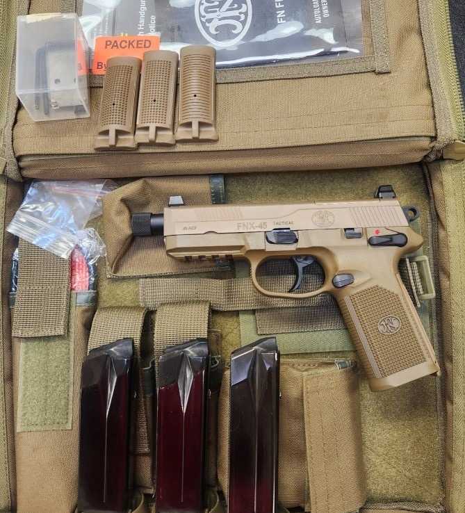 This FNX 45 Tactical is chambered in 45acp, sports a 5.25" threaded barrel, ambidextrous controls, optics ready and is topped with suppressor height night sights. included in the FN soft range bag is all appropriate paperwork, 3-15rnd magazines and all plates for most optics.